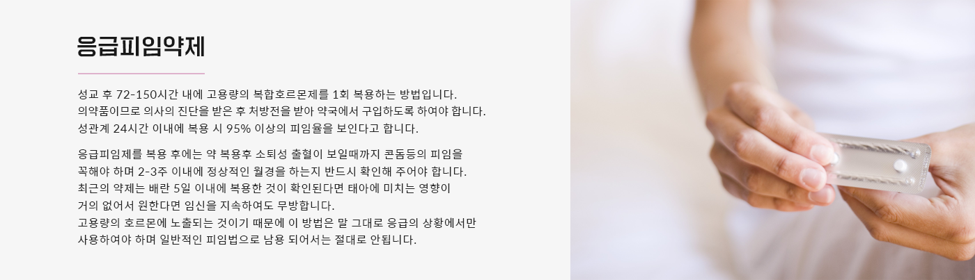 배란기라고 생각되는 시기에 피치 못할 사정으로 피임이 되지 않았을 경우, 즉 성교 직후 대처할 수 있는 피임법을 응급피임법이라고 합니다.